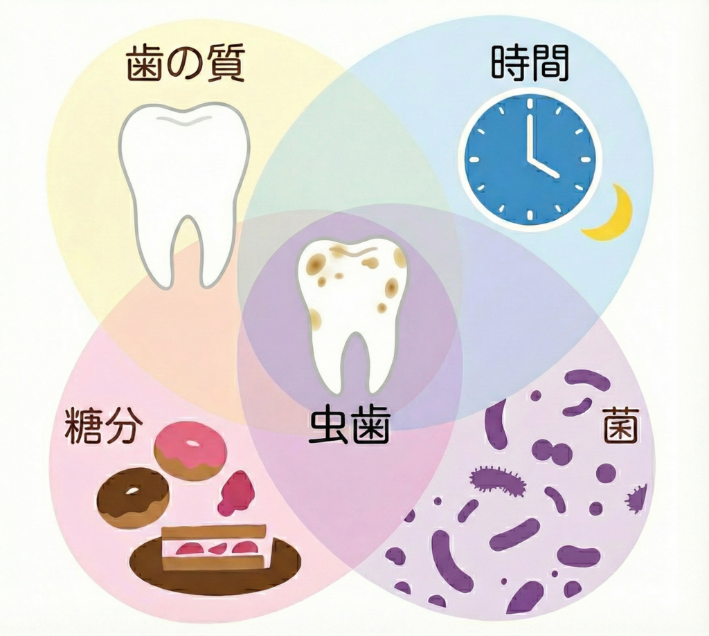 赤ちゃんは母親の虫歯菌(ミュータンス菌)を垂直感染により持ってうまれてきます。この菌は3歳までに身近なからの唾液を介して感染します。